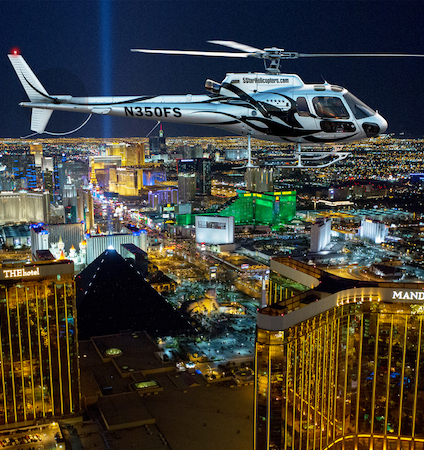 Fly mid-week and Save $45 OFF Discount on the Las Vegas helicopter night Strip tour - self drive to 5 Star Heliport located minutes away from the Las Vegas Resort hotels!